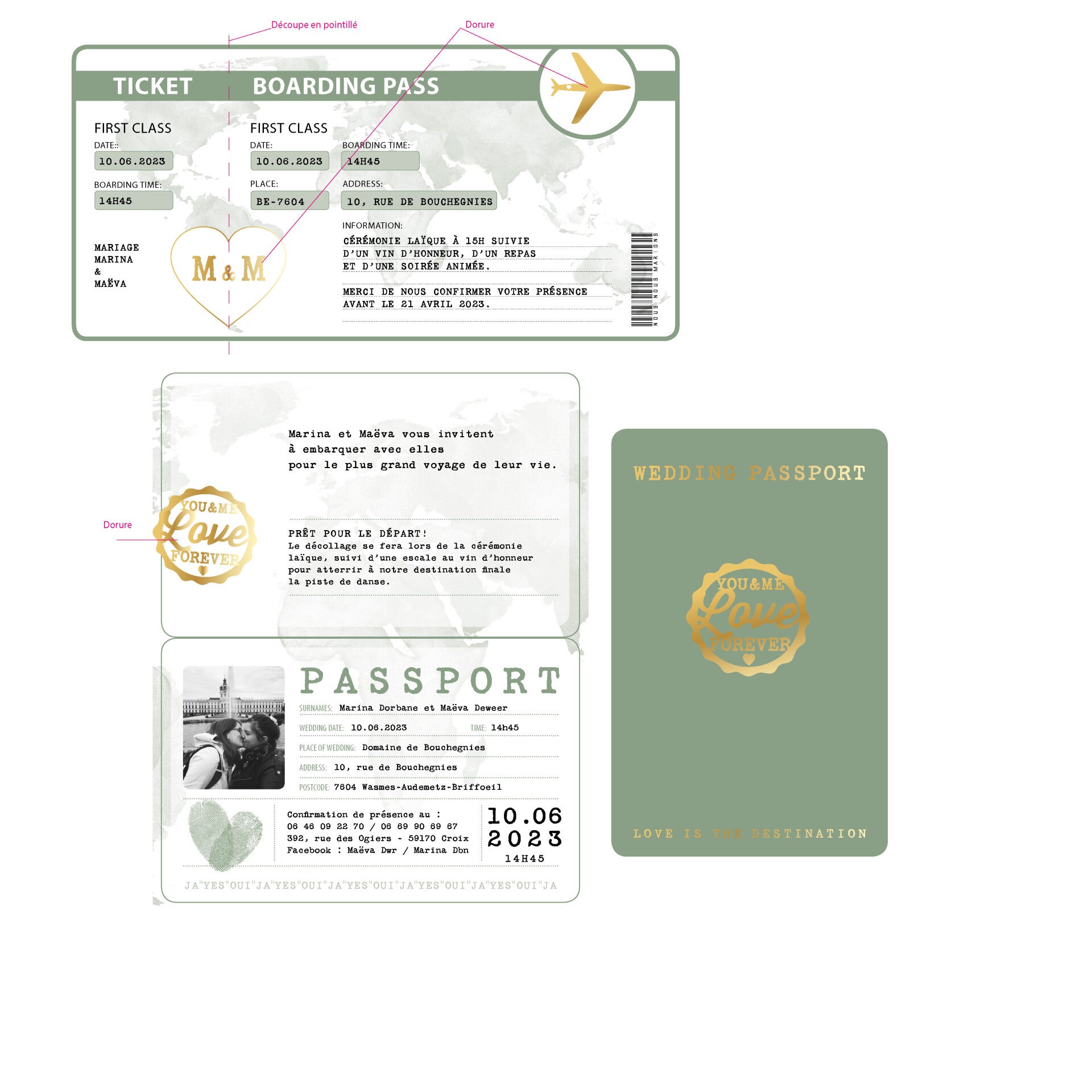 Créez une première impression inoubliable avec notre invitation mariage unique. Conçue sous forme de passeport et de billet d'avion, elle apporte une touche d'aventure à votre grand jour. Parfaite pour les mariages à thème voyage, elle garantit d'émerveiller vos invités dès le départ.