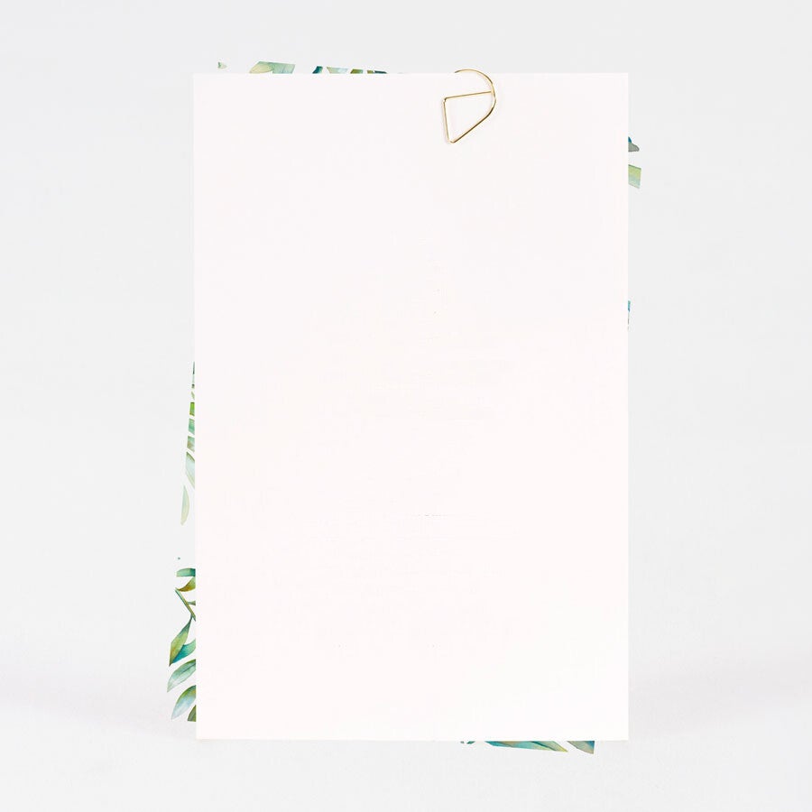 Découvrez notre faire-part de naissance avec un élégant feuillage vert sur calque, attaché par un trombone raffiné. Format 11 x 17 cm, enveloppes incluses. Parfait pour annoncer avec style l'arrivée de votre petit trésor.