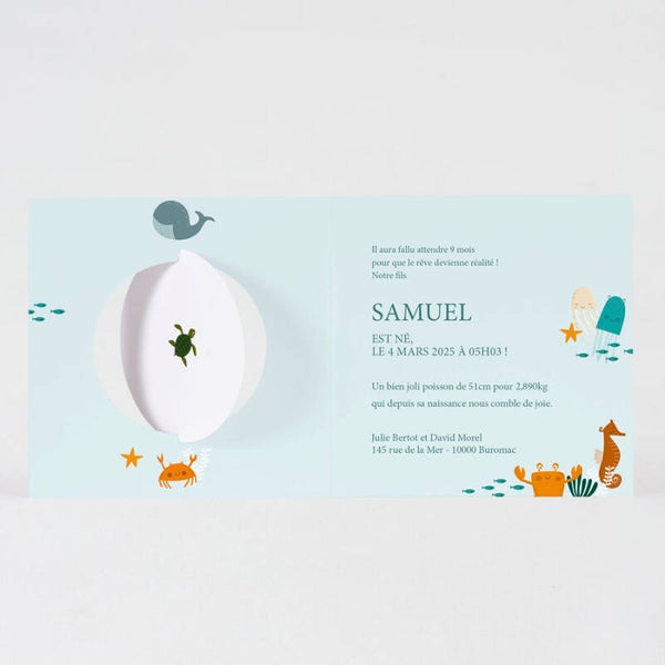 Annoncez la naissance de votre bébé avec notre faire-part thème marin. Ce format carré de 12 x 12 cm inclut une enveloppe, parfait pour partager votre joie avec simplicité et élégance.