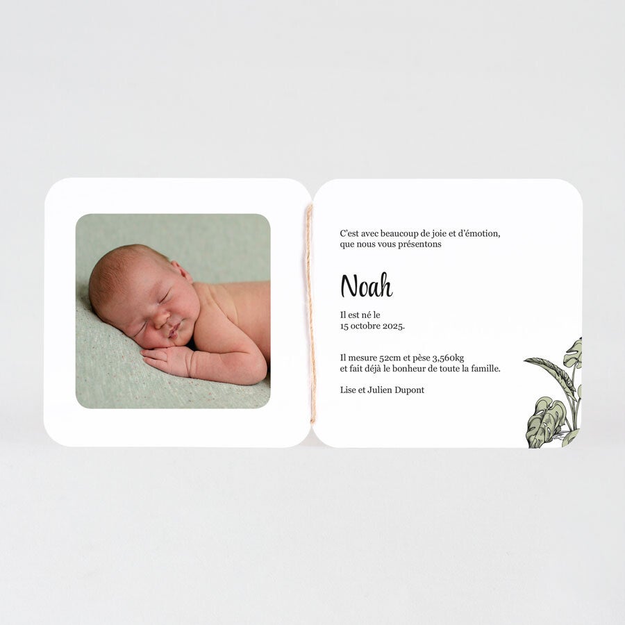 Annoncez la naissance de votre petit avec ce magnifique faire-part faune sauvage. Personnalisez-le avec une photo et le prénom de votre bébé. Le médaillon blanc, attaché par une cordelette naturelle, ajoute une touche élégante. Enveloppe incluse, format compact de 12 x 12 cm.