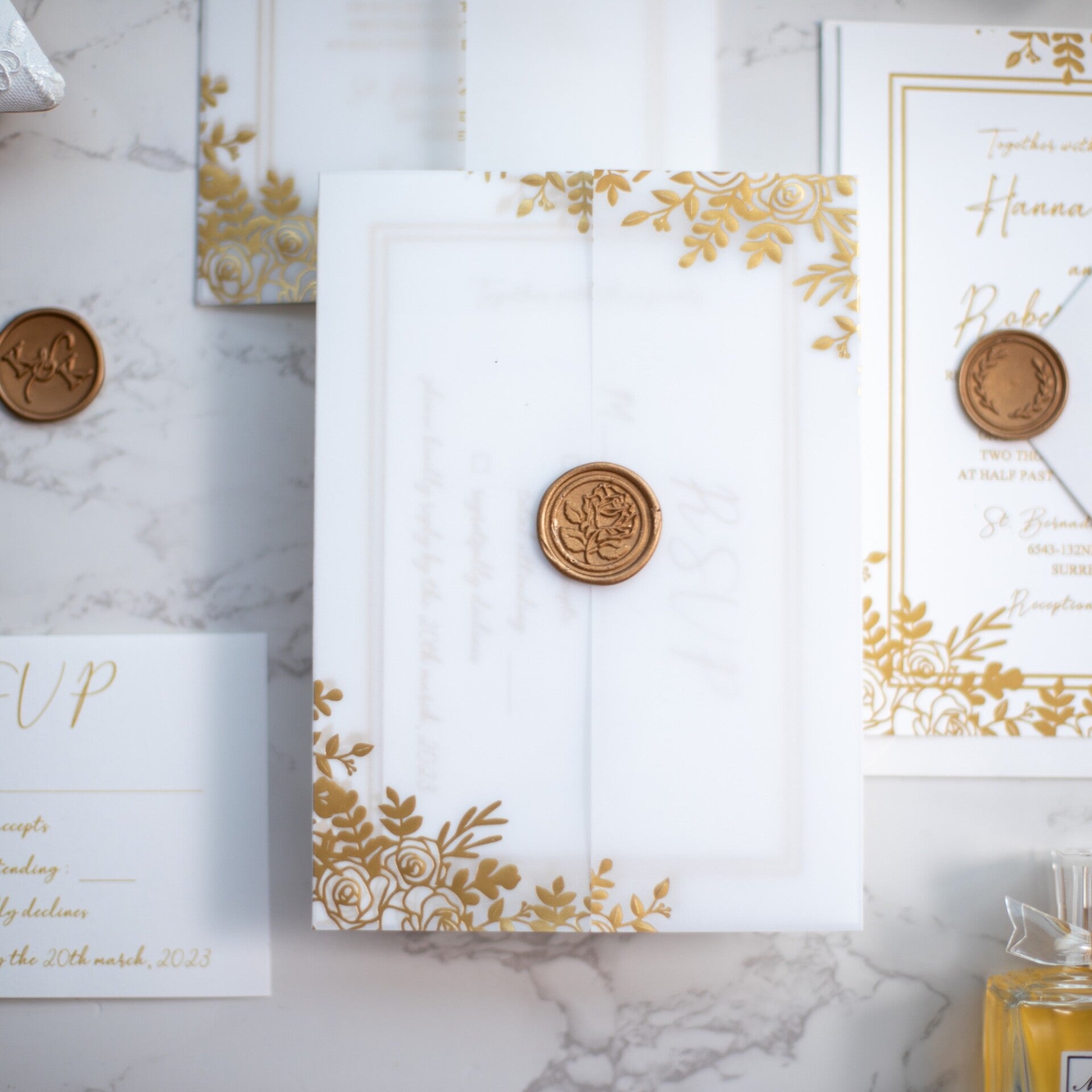 Découvrez notre faire-part de mariage raffiné avec des feuilles d'or, parfait pour une cérémonie inoubliable. Inclus une pochette sulfurique élégante et un cachet or pour un effet luxueux. Dimensions de 12,7 x 17,8 cm, idéal pour marquer votre grand jour avec style.