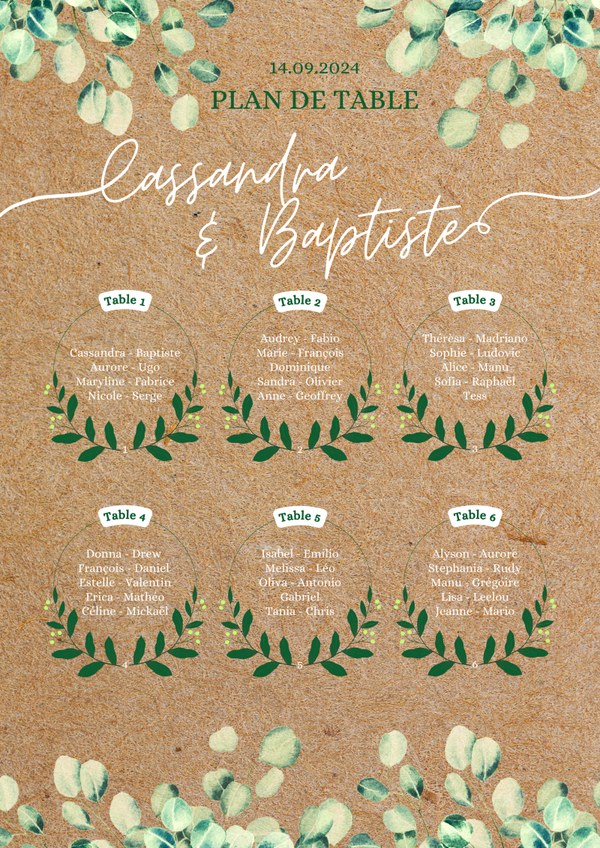 Ajoutez une touche naturelle à votre événement avec notre plan de table en fond kraft orné d'eucalyptus. Personnalisable selon vos préférences, ce plan de table allie élégance et simplicité pour un effet époustouflant. Parfait pour les mariages et autres célébrations inoubliables.