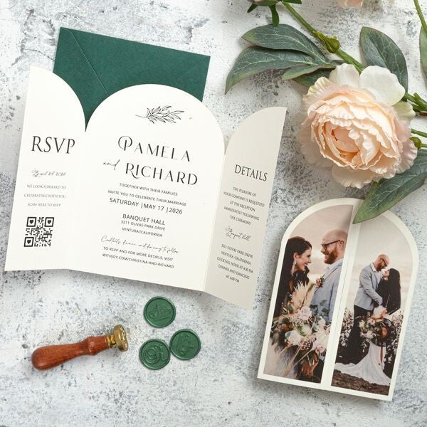 Transformez votre faire-part de mariage en un souvenir inoubliable grâce à notre invitation tout-en-un en forme d'arche. Conçue avec soin sur une carte blanche haut de gamme de 300 g/m² et imprimée numériquement, cette invitation raffinée se distingue par son format plié de 127 x 178 mm. Elle offre une impression recto verso magnifique qui saura captiver vos invités. Chaque détail a été pensé pour ajouter une touche d'élégance et de sophistication à votre événement spécial, faisant de votre invitation un véritable trésor à chérir longtemps après le grand jour. Enveloppe comprise dans le prix