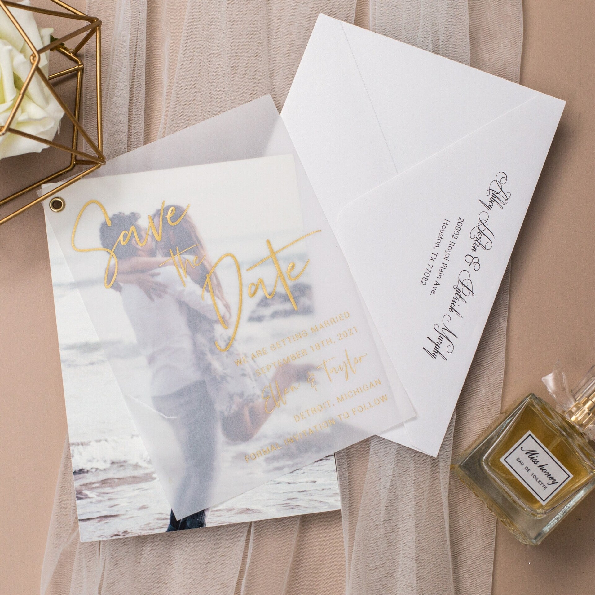 Faire-part de mariage photo, calque et éclat doré
