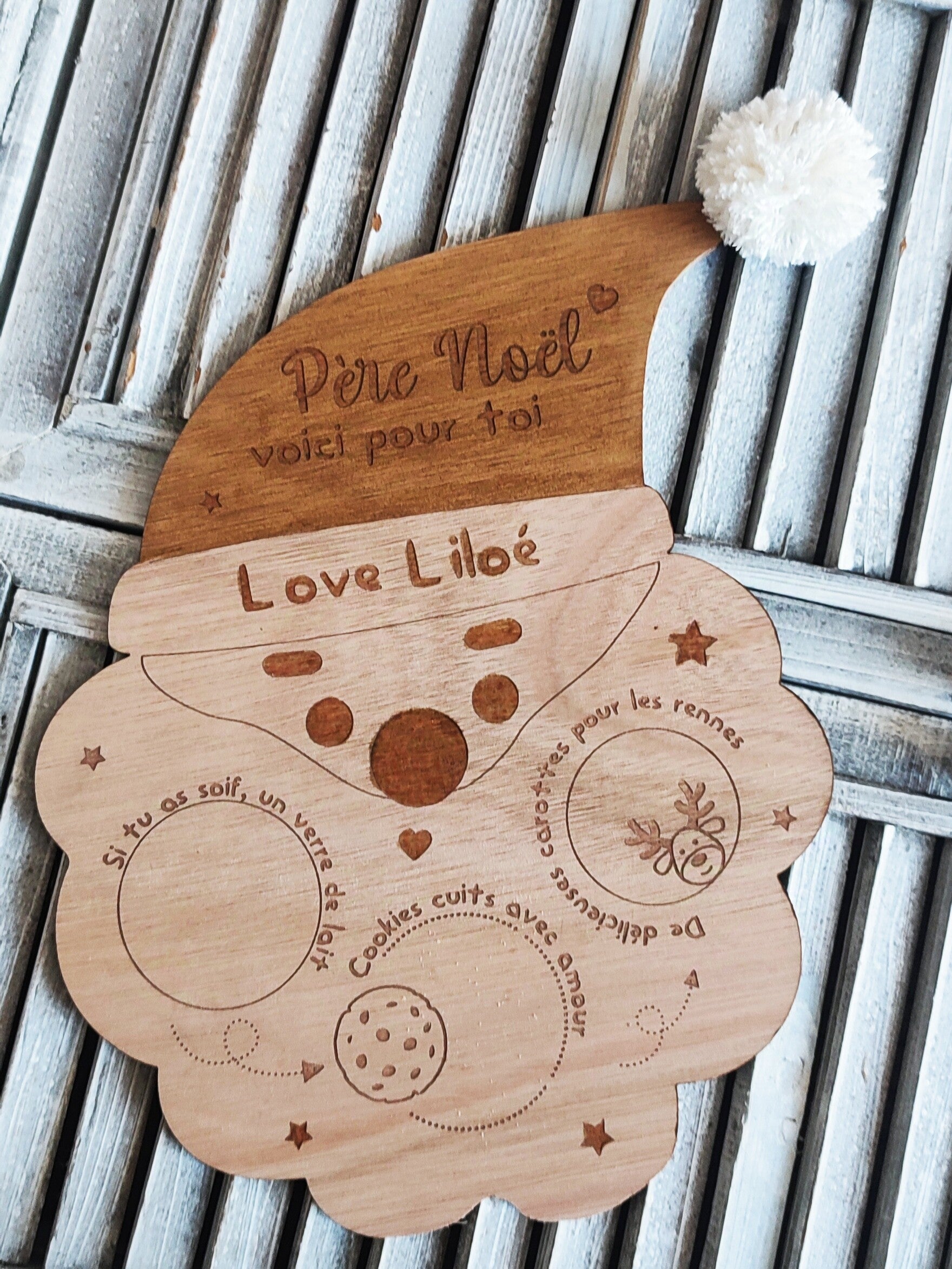 Un plateau du père Noël tout rond, à croquer, avec son bonnet et son pompon blanc qui donne le sourire ! Personnalise ton texte pour ajouter une touche magique. Format 30 x 20 cm, fabriqué en bois et gravé avec amour au laser. Parfait pour servir des douceurs festives !