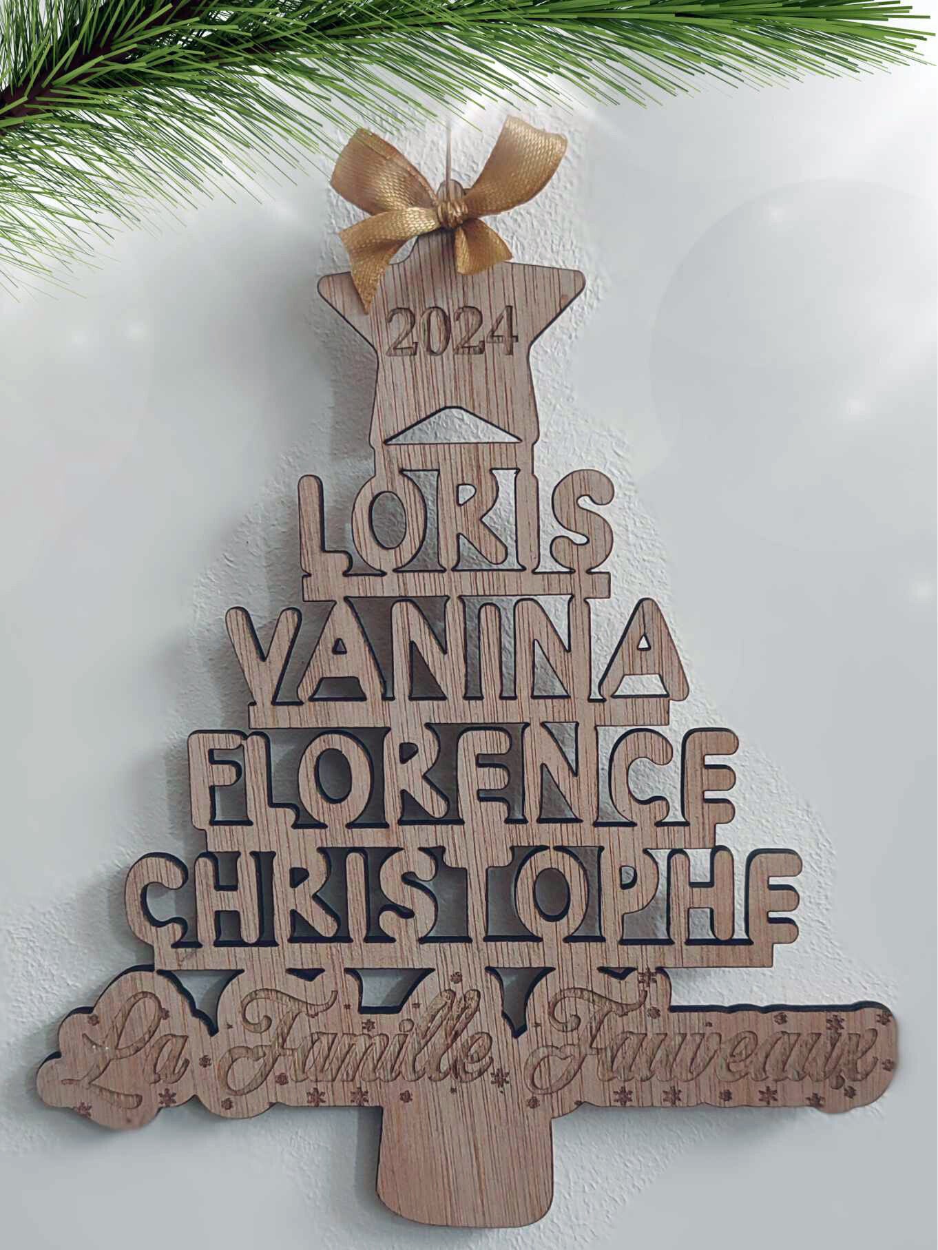 Décorations de Noël personnalisées avec les prénoms de la tribu ! Découpe et gravure laser, parce qu'on est chic même en hiver. Dimensions : 14,5 x 17 cm, parfait pour briller sous le sapin !