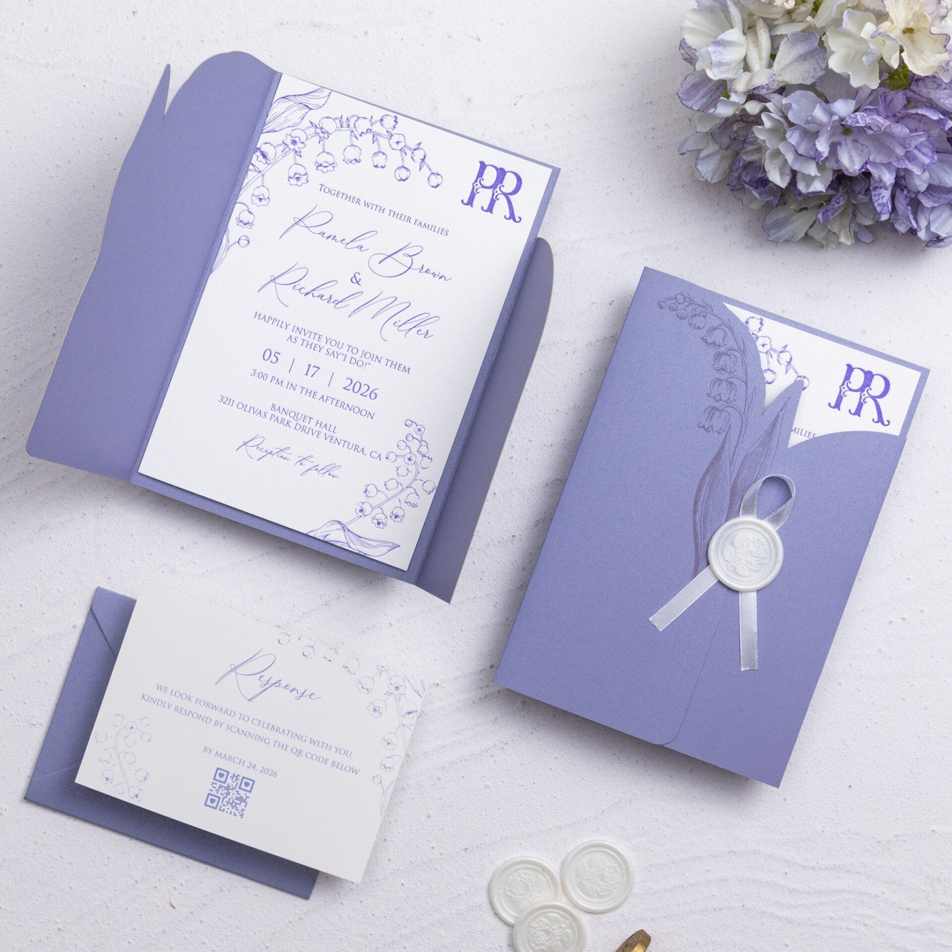 Découvrez notre invitation de mariage chic, habillée d'une couverture en carton de 300 g dans la couleur de votre rêve, avec un adorable motif de brin de muguet et une découpe stylée, le tout scellé avec un cachet de cire digne des rois ! Avec ses dimensions de 12,7 x 17,8 mm, c'est la touche pétillante qui fera briller votre événement !