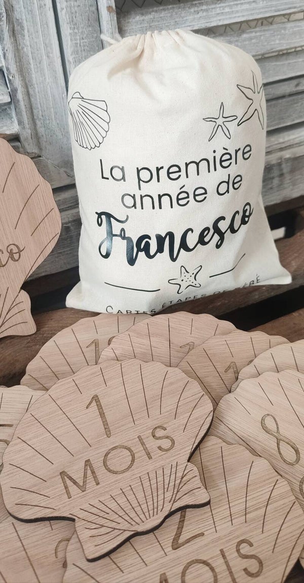 12 Cartes Étapes Mensuelles (10 cm) : Chaque carte en bois, également en forme de coquillage, est gravée des chiffres "1 MOIS", "2 MOIS", "3 MOIS", etc., jusqu'à "12 MOIS". Un accessoire charmant pour créer de superbes souvenirs photographiques à chaque étape du développement de votre enfant.
