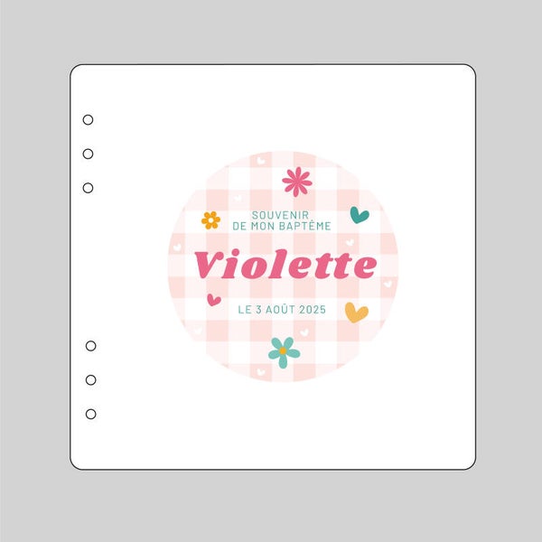 Design : La découpe circulaire laisse apparaître un motif vichy rose, orné de petites fleurs et de cœurs colorés. Le prénom de l'enfant et la date sont mis en évidence, accompagnés de l'événement "Baptême". Un texte gravé en cercle autour du motif central complète l'ensemble : "Ces doux mots de votre part seront un souvenir inoubliable."