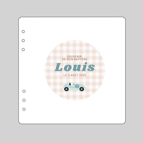 Design : Le thème "voiture de course vintage" est mis à l'honneur. La découpe ronde révèle un fond vichy dans les tons de bleu et de beige, agrémenté d'une petite voiture de course au style rétro. Le prénom de l'enfant et la date de l'événement sont inscrits au centre, accompagnés de la mention "Souvenir de mon Baptême". Une gravure circulaire autour du motif central ajoute une touche finale : "Ces doux mots de votre part seront un souvenir inoubliable".