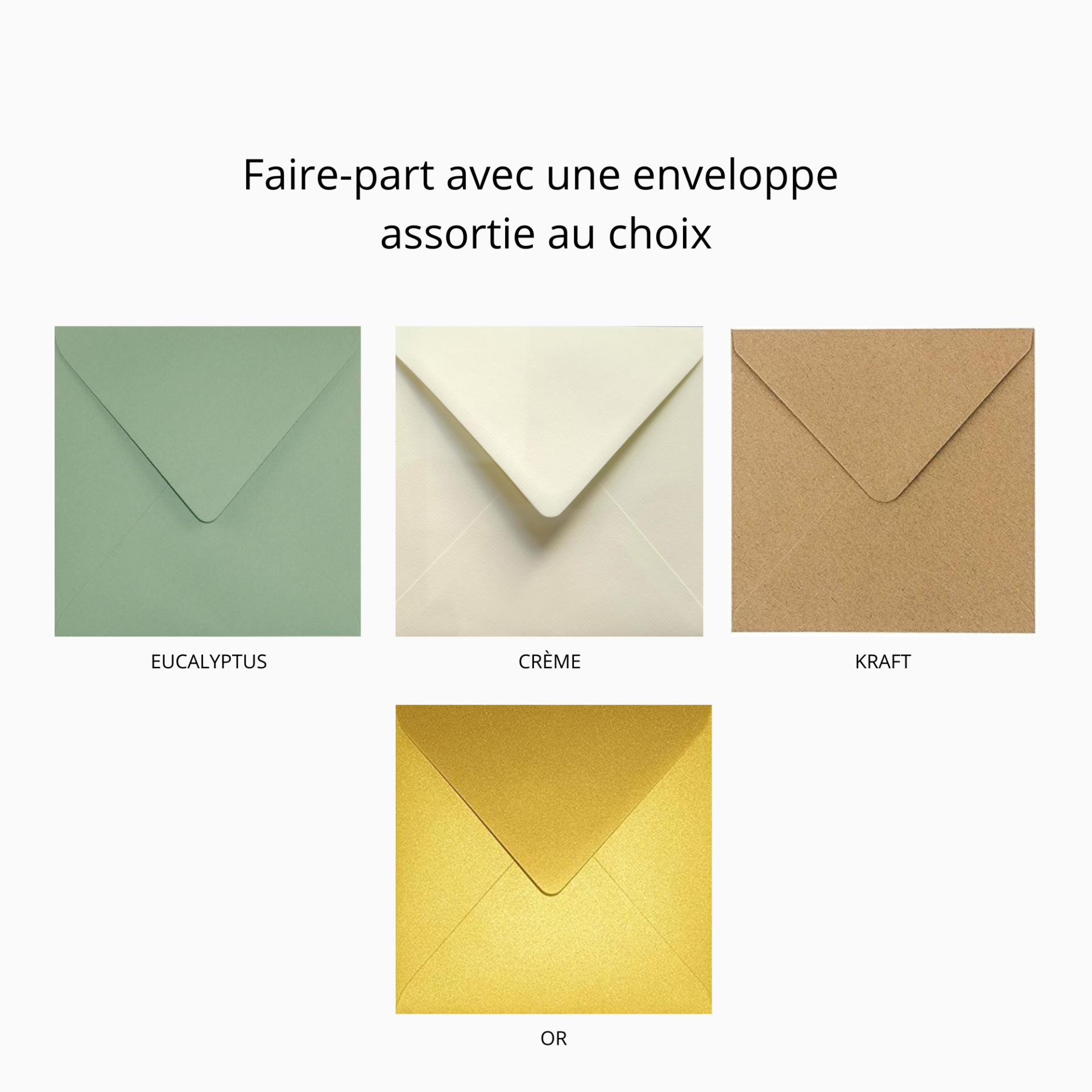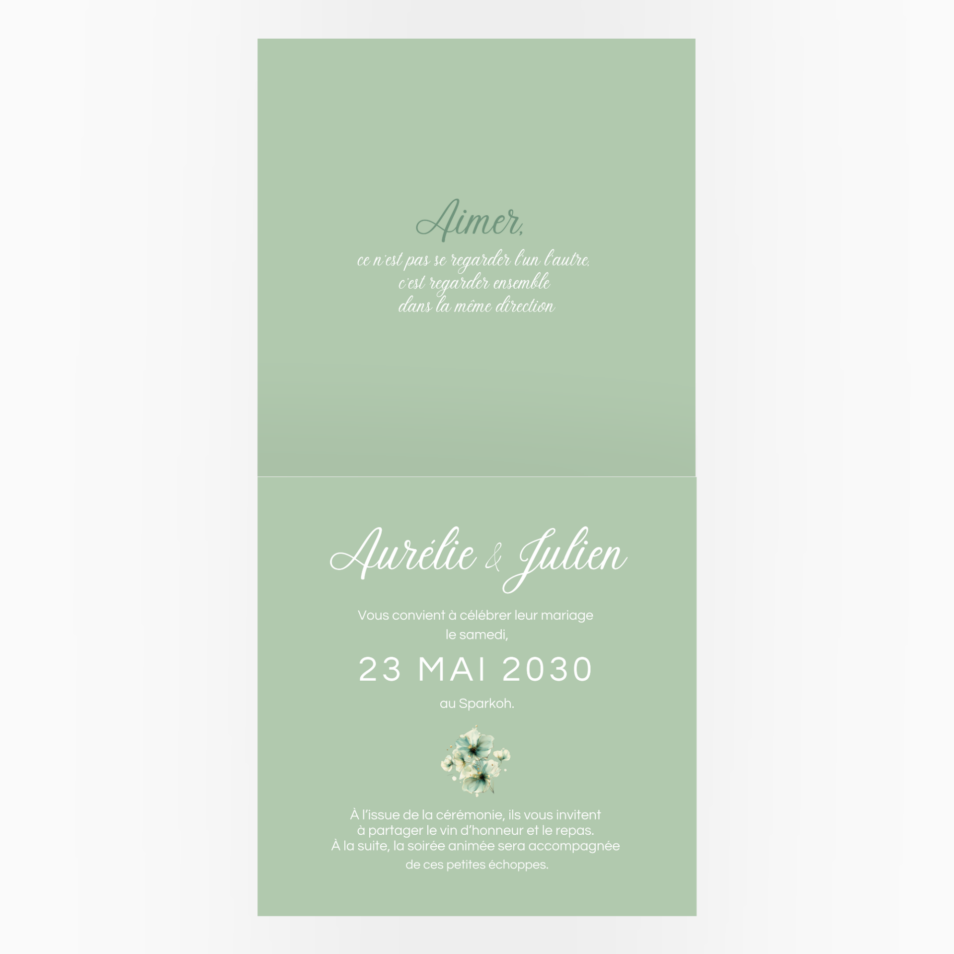 Ce faire-part de mariage de 15 x 15 cm, imprimé sur un papier structuré écru, se distingue par son design poétique. De délicates fleurs aquarellées vert d'eau et blanches, rehaussées de touches dorées, entourent un cercle scintillant. Les prénoms des mariés, Aurélie & Julien, y sont inscrits dans une calligraphie élégante.