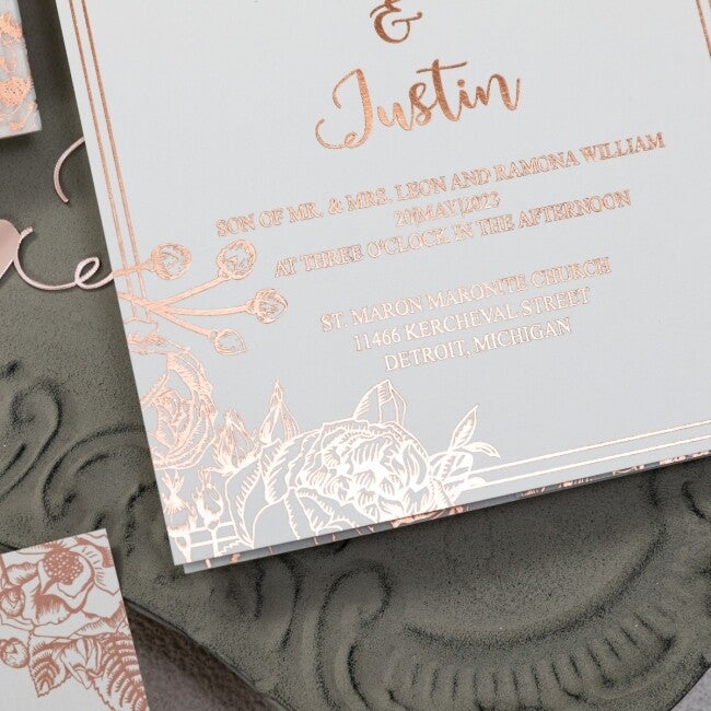 Cet ensemble comprend également la carte RSVP assortie. Un choix parfait pour une papeterie de mariage à la fois romantique et luxueuse.
