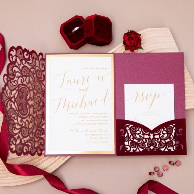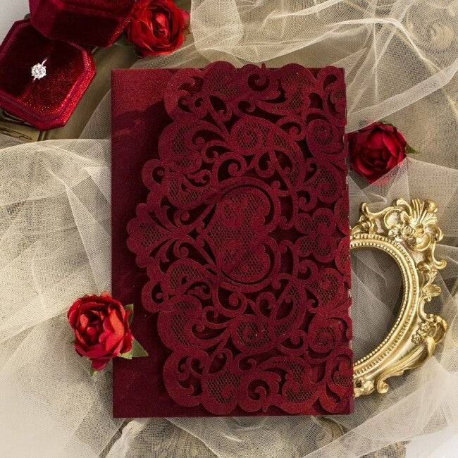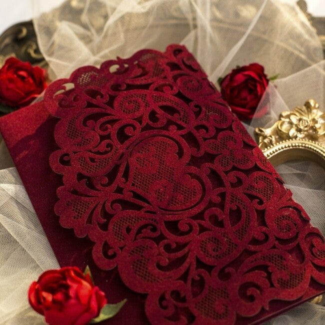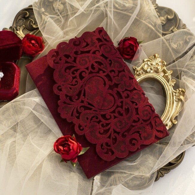 Invitation de Mariage Luxe Velours Bordeaux avec Découpe Laser