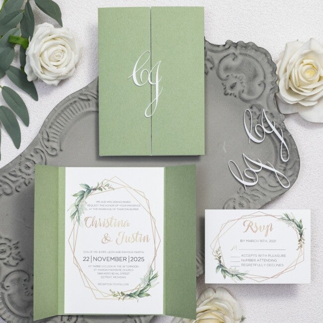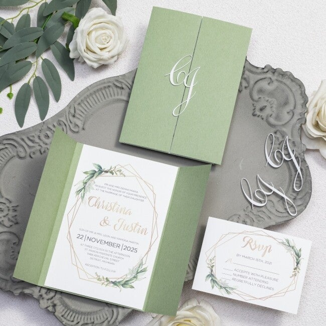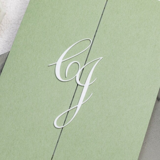 Le faire-part comprend : une pochette verte sauge, un carton principal totalement personnalisable, un carton d'invitation, les initiales découpés en plexi blanc autocollant et une enveloppe assortie.
