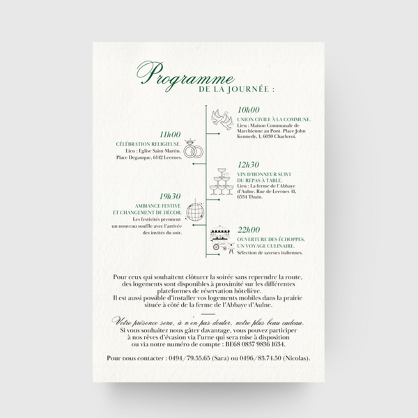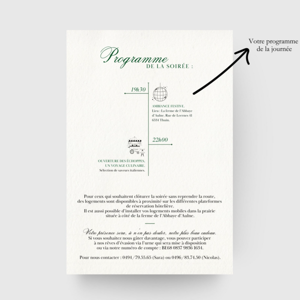 Programme Personnalisable : Le verso présente votre programme de la journée/soirée détaillé et personnalisable.