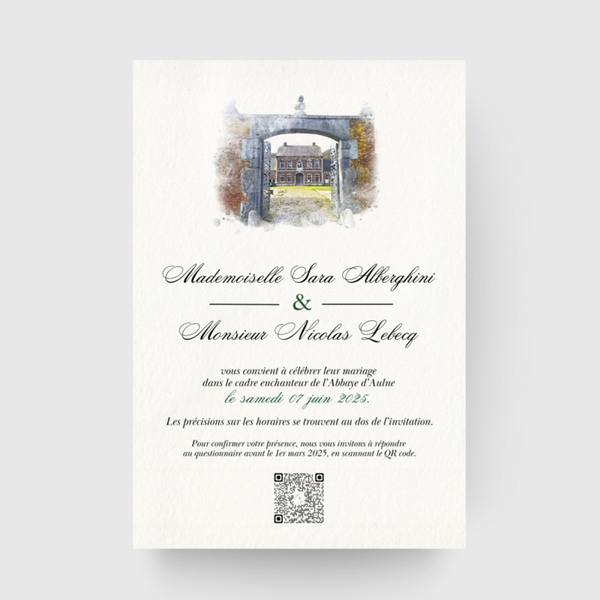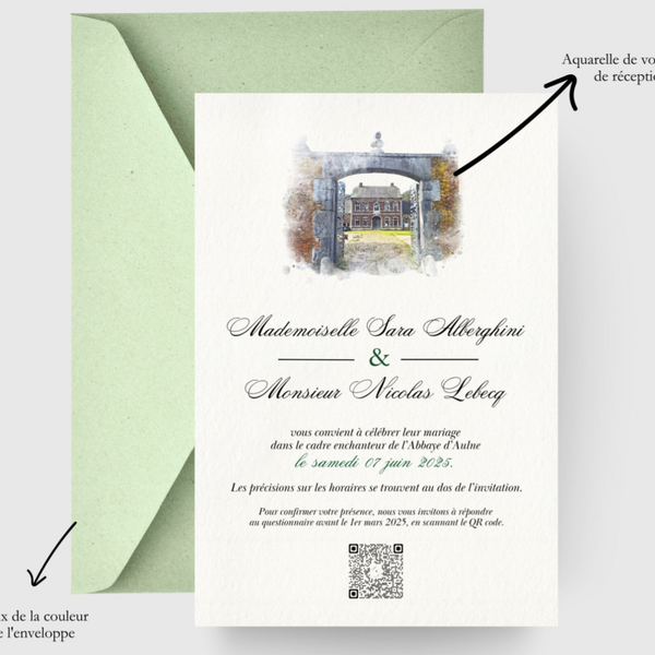 Aquarelle Personnalisée : Votre lieu de réception est transformé en une délicate aquarelle, garantissant une invitation unique.