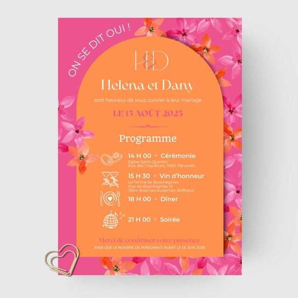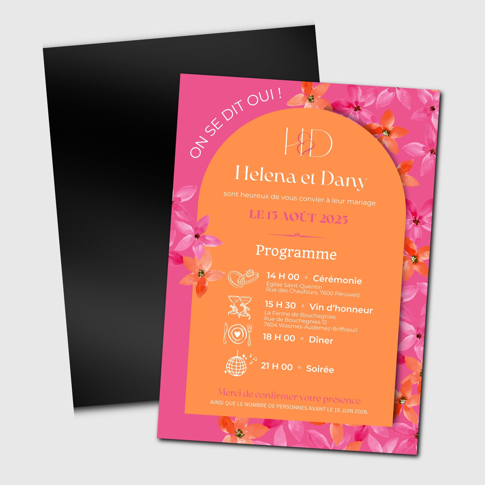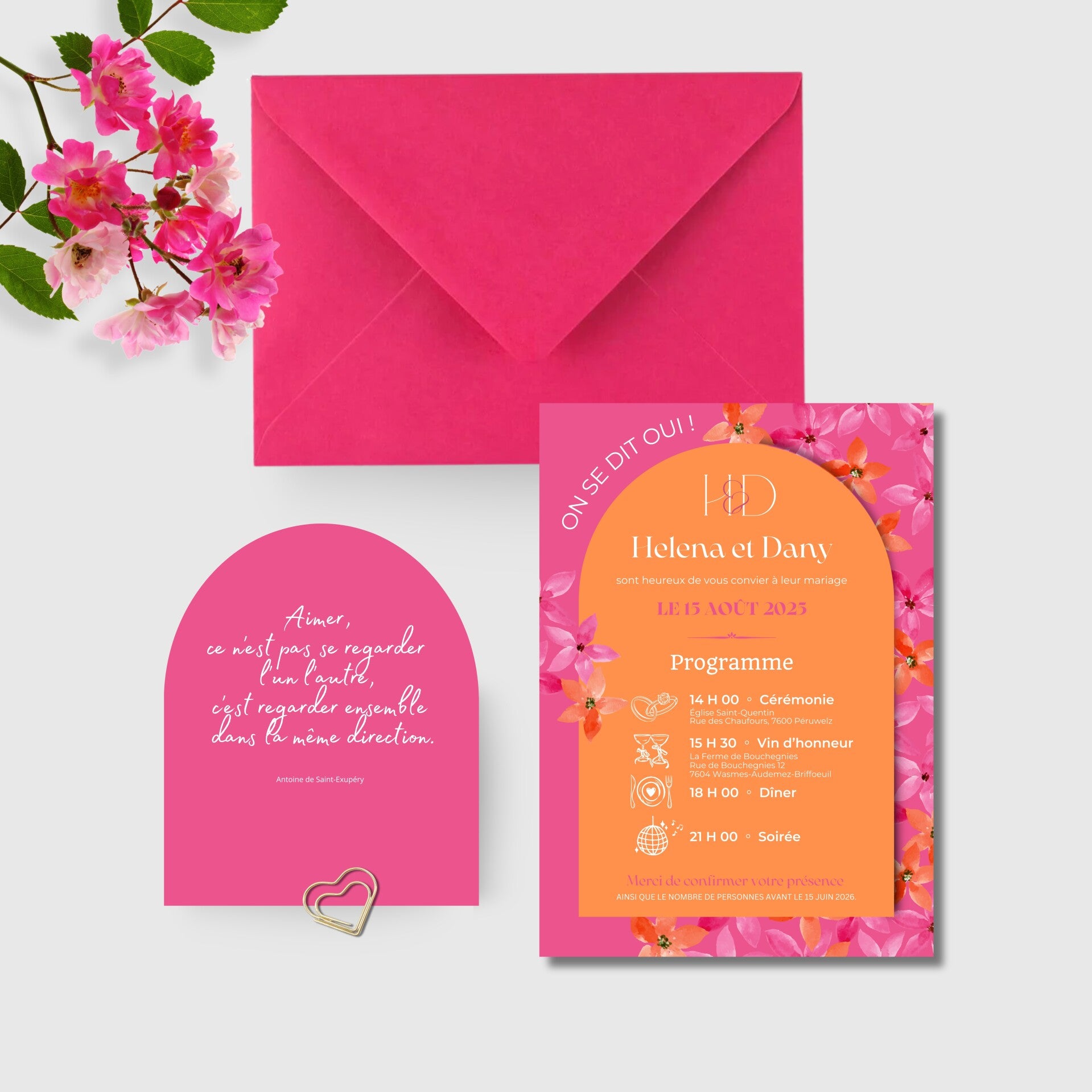 Design Dynamique : Des couleurs peps (rose fuchsia, orange vibrant) et un motif floral moderne créent une ambiance joyeuse et festive, idéale pour annoncer un mariage plein d'énergie.